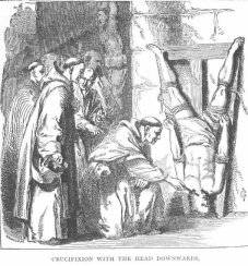 Papistry has been killing Bible believing Christians for centuries. According to Jacob Primer, in "Pastor Jacob Primmer in Rome" p. 215 upside down crucifixion is one of the tortures they used on our forefathers during the Inquisition (the picture at left was taken from the book "Pastor Jacob Primmer in Rome", sixth edition, 1912, Dunfermline Citizen office.