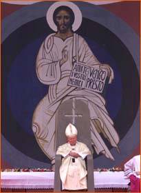 "The pope sits on the altar at Korazim. The backdrop depicts Christ with an open book that reads, 'Love your enemies, I will come soon.' "